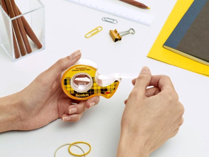 Ta¶ma samoprzylepna Scotch dwustronna. Cienka, dwustronnie klej±ca ta¶ma. Pod³o¿e ta¶my opracowano w sposób zwiêkszaj±cy wytrzyma³o¶æ mechaniczn±. Odklejana w pude³ku. Rozmiar: szeroko¶æ 12 mm, d³ugo¶æ 6,3 m.